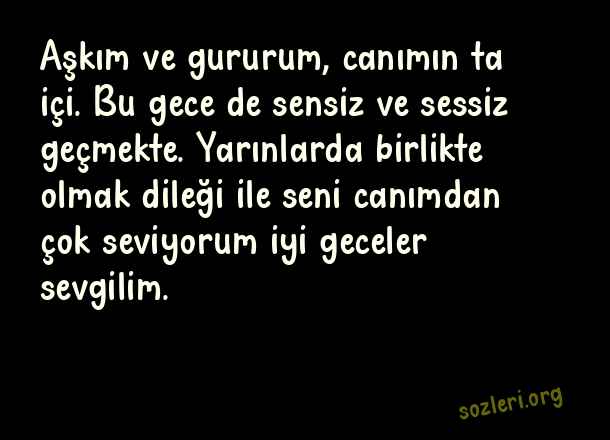 Aşkım ve gururum, canımın ta içi. Bu gece de sensiz ve sessiz geçmekte. Yarınlarda birlikte olmak dileği ile seni canımdan çok seviyorum iyi geceler sevgilim. ( İyi Geceler Sevgilim )