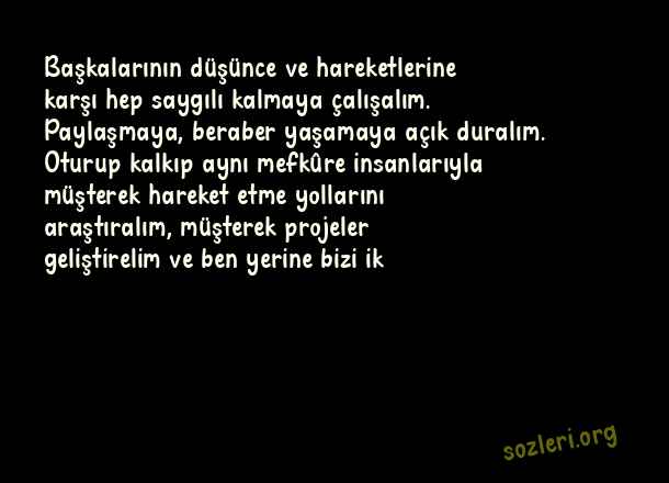 Başkalarının düşünce ve hareketlerine karşı hep saygılı kalmaya çalışalım. Paylaşmaya, beraber yaşamaya açık duralım. Oturup kalkıp aynı mefkûre insanlarıyla müşterek hareket etme yollarını araştıralım, müşterek projeler geliştirelim ve ben yerine bizi ik ( Kadir Gecesi Okunacak Dualar )