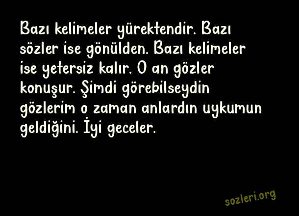 Bazı kelimeler yürektendir. Bazı sözler ise gönülden. Bazı kelimeler ise yetersiz kalır. O an gözler konuşur. Şimdi görebilseydin gözlerim o zaman anlardın uykumun geldiğini. İyi geceler. ( İyi Geceler )