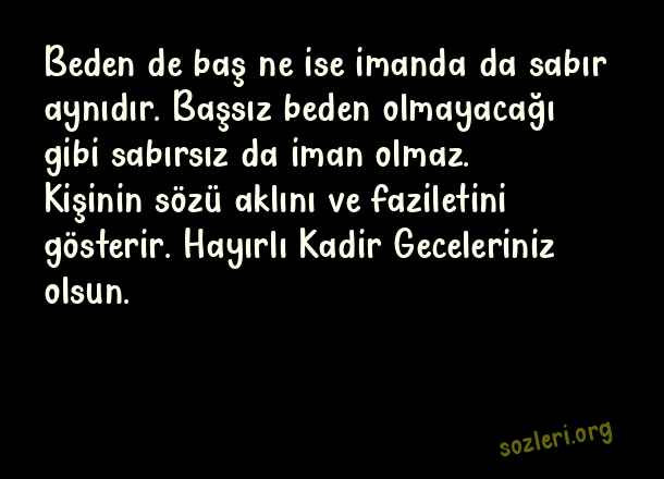 Beden de baş ne ise imanda da sabır aynıdır. Başsız beden olmayacağı gibi sabırsız da iman olmaz. Kişinin sözü aklını ve faziletini gösterir. Hayırlı Kadir Geceleriniz olsun. ( Kadir Gecesi İle İlgili Kutlama )