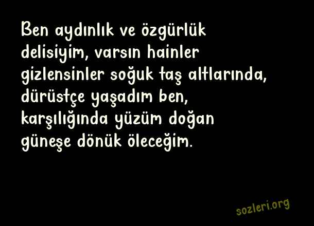 Ben aydınlık ve özgürlük delisiyim, varsın hainler gizlensinler soğuk taş altlarında, dürüstçe yaşadım ben, karşılığında yüzüm doğan güneşe dönük öleceğim. ( Etkileyici İyi Geceler )