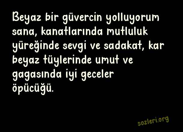 Beyaz bir güvercin yolluyorum sana, kanatlarında mutluluk yüreğinde sevgi ve sadakat, kar beyaz tüylerinde umut ve gagasında iyi geceler öpücüğü. ( İyi Geceler )