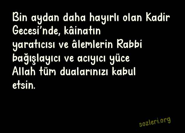 Bin aydan daha hayırlı olan Kadir Gecesi’nde, kâinatın yaratıcısı ve âlemlerin Rabbi bağışlayıcı ve acıyıcı yüce Allah tüm dualarınızı kabul etsin. ( Kadir Gecesi İle İlgili Kutlama )