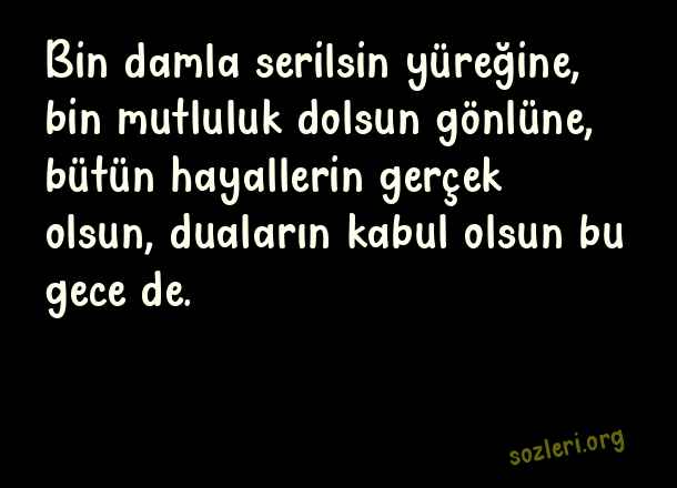 Bin damla serilsin yüreğine, bin mutluluk dolsun gönlüne, bütün hayallerin gerçek olsun, duaların kabul olsun bu gece de. ( Anneye İyi Geceler )