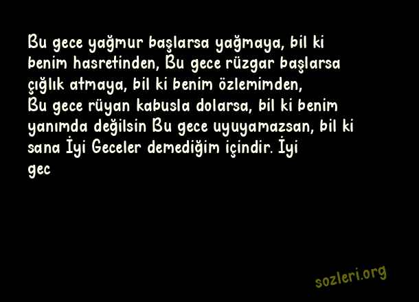 Bu gece yağmur başlarsa yağmaya, bil ki benim hasretinden, Bu gece rüzgar başlarsa çığlık atmaya, bil ki benim özlemimden, Bu gece rüyan kabusla dolarsa, bil ki benim yanımda değilsin Bu gece uyuyamazsan, bil ki sana İyi Geceler demediğim içindir. İyi gec ( Uzaktaki Sevgiliye İyi Geceler )