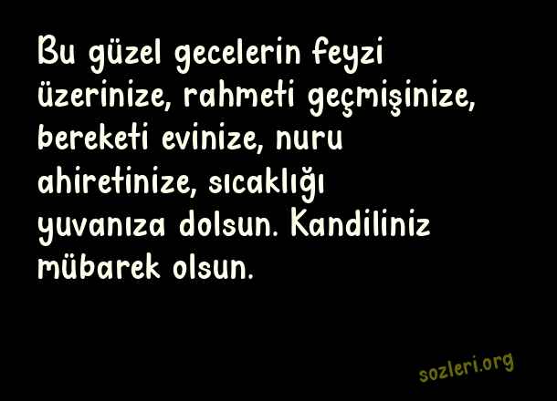 Bu güzel gecelerin feyzi üzerinize, rahmeti geçmişinize, bereketi evinize, nuru ahiretinize, sıcaklığı yuvanıza dolsun. Kandiliniz mübarek olsun. ( Kadir Gecesi İle İlgili Kutlama )
