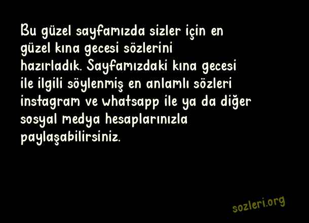 Bu güzel sayfamızda sizler için en güzel kına gecesi sözlerini hazırladık. Sayfamızdaki kına gecesi ile ilgili söylenmiş en anlamlı sözleri instagram ve whatsapp ile ya da diğer sosyal medya hesaplarınızla paylaşabilirsiniz. ( Kına Gecesi )