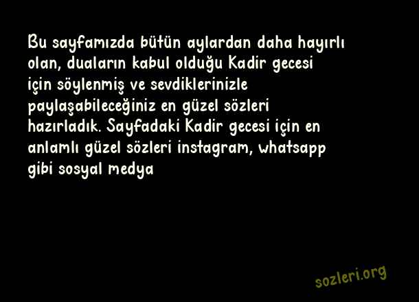 Bu sayfamızda bütün aylardan daha hayırlı olan, duaların kabul olduğu Kadir gecesi için söylenmiş ve sevdiklerinizle paylaşabileceğiniz en güzel sözleri hazırladık. Sayfadaki Kadir gecesi için en anlamlı güzel sözleri instagram, whatsapp gibi sosyal medya ( Kadir Gecesi İçin Güzel Sözler )