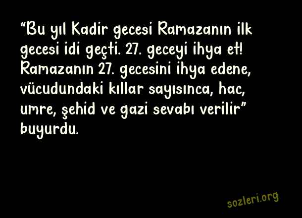“Bu yıl Kadir gecesi Ramazanın ilk gecesi idi geçti. 27. geceyi ihya et! Ramazanın 27. gecesini ihya edene, vücudundaki kıllar sayısınca, hac, umre, şehid ve gazi sevabı verilir” buyurdu. ( Kadir Gecesinde Neler Yapılır )