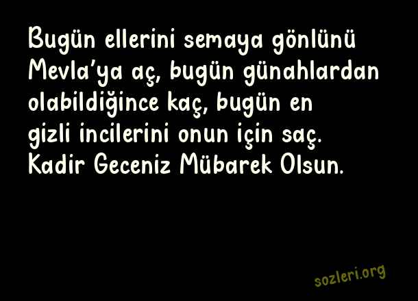 Bugün ellerini semaya gönlünü Mevla’ya aç, bugün günahlardan olabildiğince kaç, bugün en gizli incilerini onun için saç. Kadir Geceniz Mübarek Olsun. ( Kadir Gecesi İçin Güzel Sözler )
