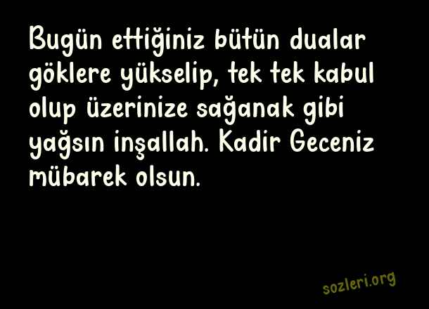 Bugün ettiğiniz bütün dualar göklere yükselip, tek tek kabul olup üzerinize sağanak gibi yağsın inşallah. Kadir Geceniz mübarek olsun. ( Kadir Gecesi İle İlgili Kutlama )