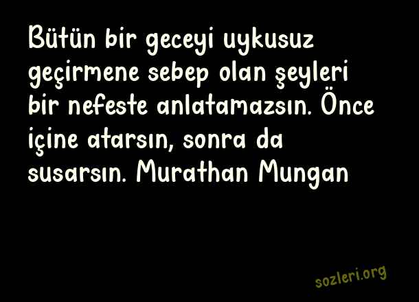 Bütün bir geceyi uykusuz geçirmene sebep olan şeyleri bir nefeste anlatamazsın. Önce içine atarsın, sonra da susarsın. Murathan Mungan ( Siyah Gece )