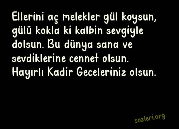 Ellerini aç melekler gül koysun, gülü kokla ki kalbin sevgiyle dolsun. Bu dünya sana ve sevdiklerine cennet olsun. Hayırlı Kadir Geceleriniz olsun. ( Kadir Gecesi İle İlgili Kutlama )