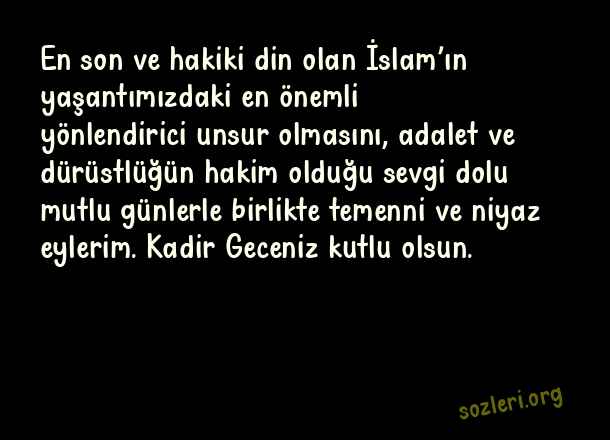 En son ve hakiki din olan İslam’ın yaşantımızdaki en önemli yönlendirici unsur olmasını, adalet ve dürüstlüğün hakim olduğu sevgi dolu mutlu günlerle birlikte temenni ve niyaz eylerim. Kadir Geceniz kutlu olsun. ( Kadir Gecesi İle İlgili Kutlama )