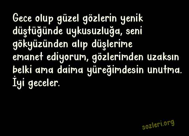 Gece olup güzel gözlerin yenik düştüğünde uykusuzluğa, seni gökyüzünden alıp düşlerime emanet ediyorum, gözlerimden uzaksın belki ama daima yüreğimdesin unutma. İyi geceler. ( Whatsapp İyi Geceler )