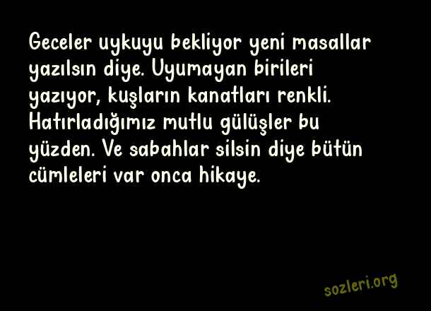 Geceler uykuyu bekliyor yeni masallar yazılsın diye. Uyumayan birileri yazıyor, kuşların kanatları renkli. Hatırladığımız mutlu gülüşler bu yüzden. Ve sabahlar silsin diye bütün cümleleri var onca hikaye. ( Geceye Notlar )