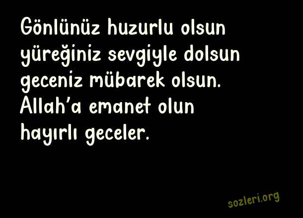 Gönlünüz huzurlu olsun yüreğiniz sevgiyle dolsun geceniz mübarek olsun. Allah’a emanet olun hayırlı geceler. ( Hayırlı Geceler )