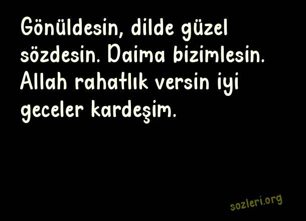 Gönüldesin, dilde güzel sözdesin. Daima bizimlesin. Allah rahatlık versin iyi geceler kardeşim. ( Arkadaşa İyi Geceler )