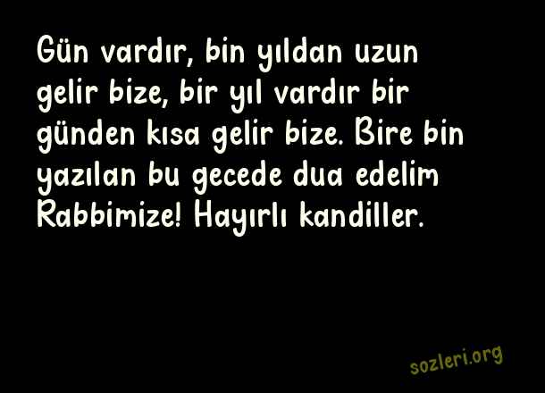 Gün vardır, bin yıldan uzun gelir bize, bir yıl vardır bir günden kısa gelir bize. Bire bin yazılan bu gecede dua edelim Rabbimize! Hayırlı kandiller. ( Kadir Gecesi İle İlgili Kutlama )