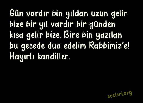 Gün vardır bin yıldan uzun gelir bize bir yıl vardır bir günden kısa gelir bize. Bire bin yazılan bu gecede dua edelim Rabbimiz’e! Hayırlı kandiller. ( Kadir Gecesi İçin Güzel Sözler )
