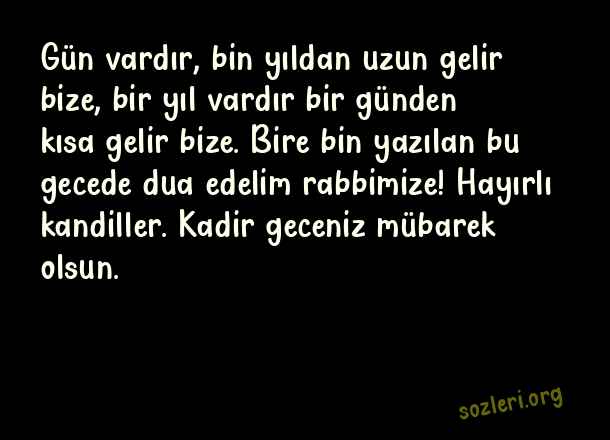 Gün vardır, bin yıldan uzun gelir bize, bir yıl vardır bir günden kısa gelir bize. Bire bin yazılan bu gecede dua edelim rabbimize! Hayırlı kandiller. Kadir geceniz mübarek olsun. ( Kadir Gecesi Telefon )