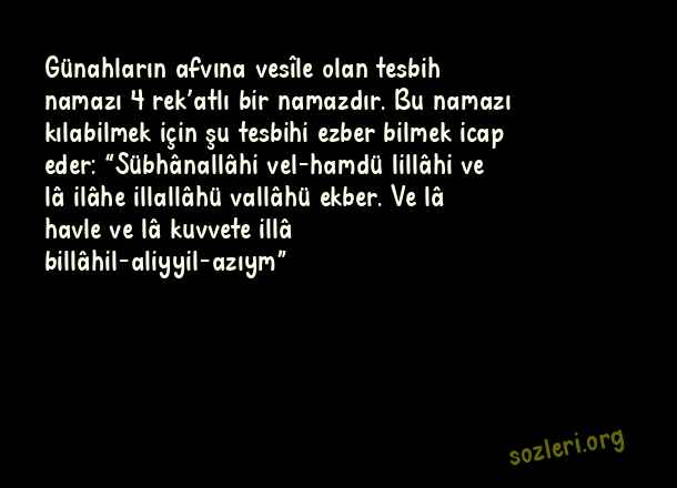 Günahların afvına vesîle olan tesbih namazı 4 rek’atlı bir namazdır. Bu namazı kılabilmek için şu tesbihi ezber bilmek icap eder: “Sübhânallâhi vel-hamdü lillâhi ve lâ ilâhe illallâhü vallâhü ekber. Ve lâ havle ve lâ kuvvete illâ billâhil-aliyyil-azıym” ( Kadir Gecesinde Neler Yapılır )