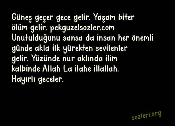Güneş geçer gece gelir. Yaşam biter ölüm gelir. Unutulduğunu sansa da insan her önemli günde akla ilk yürekten sevilenler gelir. Yüzünde nur aklında ilim kalbinde Allah La ilahe illallah. Hayırlı geceler. ( Hayırlı Geceler )