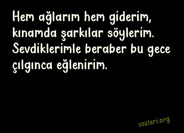 Hem ağlarım hem giderim, kınamda şarkılar söylerim. Sevdiklerimle beraber bu gece çılgınca eğlenirim. ( Kına Gecesi )