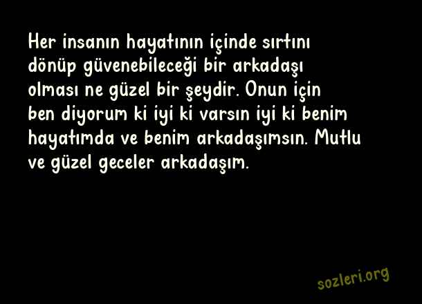 Her insanın hayatının içinde sırtını dönüp güvenebileceği bir arkadaşı olması ne güzel bir şeydir. Onun için ben diyorum ki iyi ki varsın iyi ki benim hayatımda ve benim arkadaşımsın. Mutlu ve güzel geceler arkadaşım. ( Arkadaşa İyi Geceler )