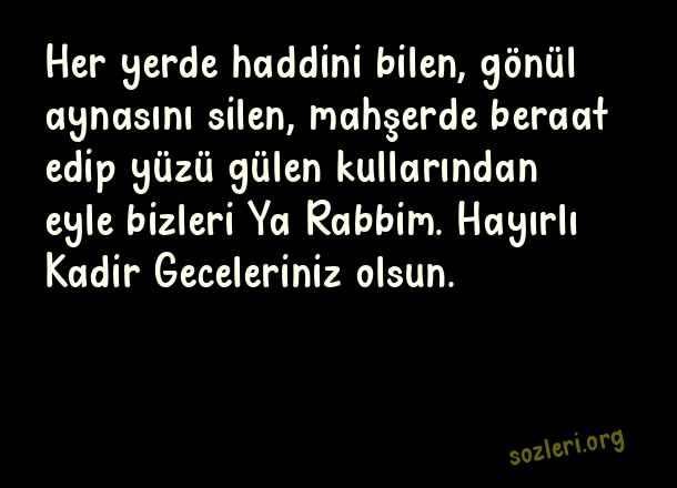 Her yerde haddini bilen, gönül aynasını silen, mahşerde beraat edip yüzü gülen kullarından eyle bizleri Ya Rabbim. Hayırlı Kadir Geceleriniz olsun. ( Kadir Gecesi İle İlgili Kutlama )