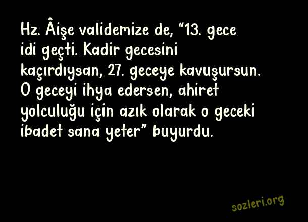 Hz. Âişe validemize de, “13. gece idi geçti. Kadir gecesini kaçırdıysan, 27. geceye kavuşursun. O geceyi ihya edersen, ahiret yolculuğu için azık olarak o geceki ibadet sana yeter” buyurdu. ( Kadir Gecesinde Neler Yapılır )