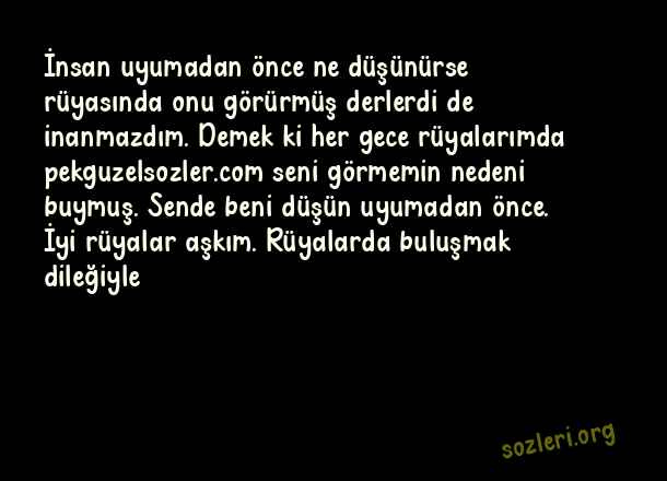 İnsan uyumadan önce ne düşünürse rüyasında onu görürmüş derlerdi de inanmazdım. Demek ki her gece rüyalarımda seni görmemin nedeni buymuş. Sende beni düşün uyumadan önce. İyi rüyalar aşkım. Rüyalarda buluşmak dileğiyle… ( İyi Geceler )