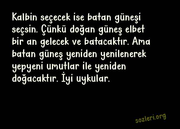 Kalbin seçecek ise batan güneşi seçsin. Çünkü doğan güneş elbet bir an gelecek ve batacaktır. Ama batan güneş yeniden yenilenerek yepyeni umutlar ile yeniden doğacaktır. İyi uykular. ( Whatsapp İyi Geceler )