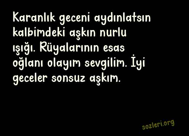 Karanlık geceni aydınlatsın kalbimdeki aşkın nurlu ışığı. Rüyalarının esas oğlanı olayım sevgilim. İyi geceler sonsuz aşkım. ( Whatsapp İyi Geceler )