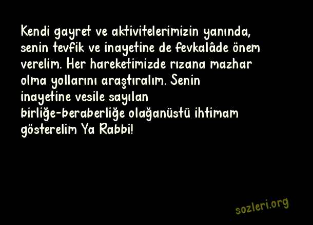 Kendi gayret ve aktivitelerimizin yanında, senin tevfik ve inayetine de fevkalâde önem verelim. Her hareketimizde rızana mazhar olma yollarını araştıralım. Senin inayetine vesile sayılan birliğe-beraberliğe olağanüstü ihtimam gösterelim Ya Rabbi! ( Kadir Gecesi Okunacak Dualar )