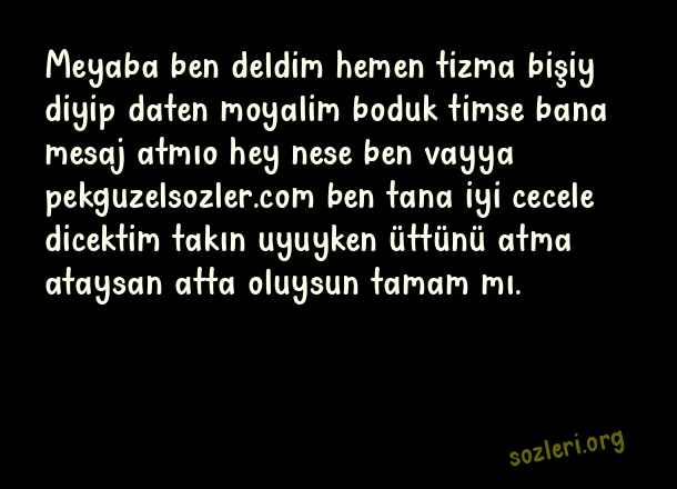 Meyaba ben deldim hemen tizma bişiy diyip daten moyalim boduk timse bana mesaj atmıo hey nese ben vayya ben tana iyi cecele dicektim takın uyuyken üttünü atma ataysan atta oluysun tamam mı. ( Komik İyi Geceler )