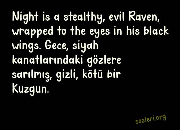 Night is a stealthy, evil Raven, wrapped to the eyes in his black wings. Gece, siyah kanatlarındaki gözlere sarılmış, gizli, kötü bir Kuzgun. ( Gece İle İlgili İngilizce Sözler )