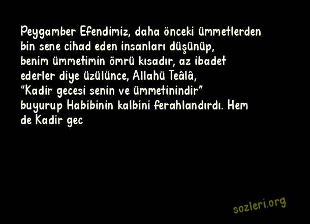 Peygamber Efendimiz, daha önceki ümmetlerden bin sene cihad eden insanları düşünüp, benim ümmetimin ömrü kısadır, az ibadet ederler diye üzülünce, Allahü Teâlâ, “Kadir gecesi senin ve ümmetinindir” buyurup Habibinin kalbini ferahlandırdı. Hem de Kadir gec ( Kadir Gecesinde Neler Yapılır )
