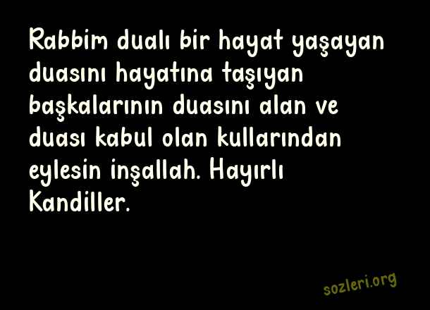 Rabbim dualı bir hayat yaşayan duasını hayatına taşıyan başkalarının duasını alan ve duası kabul olan kullarından eylesin inşallah. Hayırlı Kandiller. ( Kadir Gecesi )
