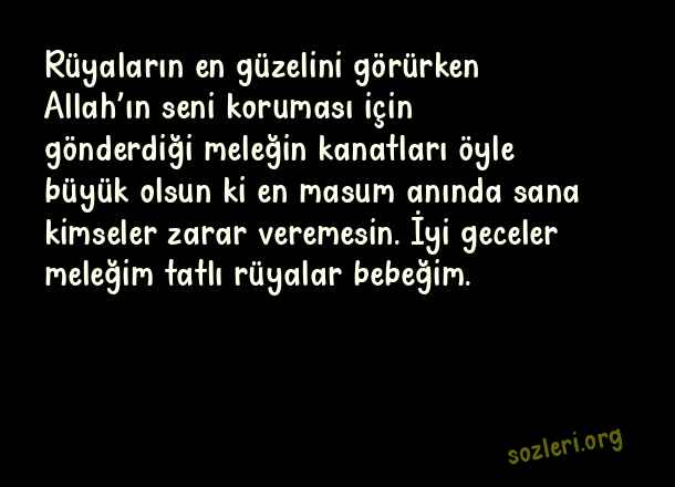 Rüyaların en güzelini görürken Allah’ın seni koruması için gönderdiği meleğin kanatları öyle büyük olsun ki en masum anında sana kimseler zarar veremesin. İyi geceler meleğim tatlı rüyalar bebeğim. ( İnstagram İyi Geceler )