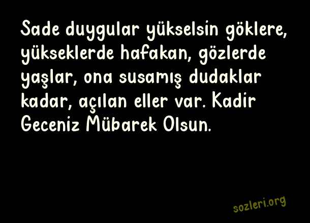 Sade duygular yükselsin göklere, yükseklerde hafakan, gözlerde yaşlar, ona susamış dudaklar kadar, açılan eller var. Kadir Geceniz Mübarek Olsun. ( Kadir Gecesi İle İlgili Kutlama )