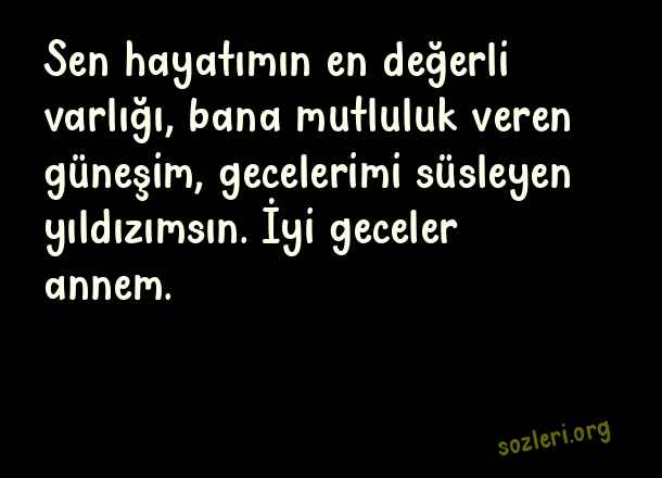 Sen hayatımın en değerli varlığı, bana mutluluk veren güneşim, gecelerimi süsleyen yıldızımsın. İyi geceler annem. ( Anneye İyi Geceler )