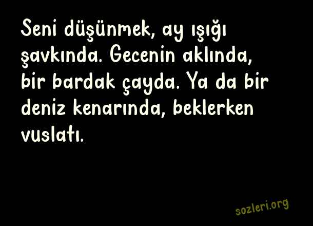Seni düşünmek, ay ışığı şavkında. Gecenin aklında, bir bardak çayda. Ya da bir deniz kenarında, beklerken vuslatı. ( Geceye Notlar )