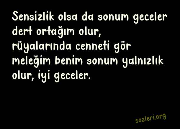 Sensizlik olsa da sonum geceler dert ortağım olur, rüyalarında cenneti gör meleğim benim sonum yalnızlık olur, iyi geceler. ( Etkileyici İyi Geceler )