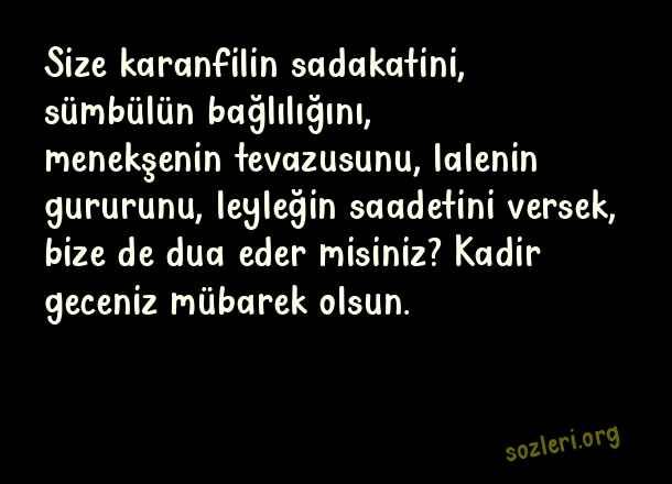 Size karanfilin sadakatini, sümbülün bağlılığını, menekşenin tevazusunu, lalenin gururunu, leyleğin saadetini versek, bize de dua eder misiniz? Kadir geceniz mübarek olsun. ( Kadir Gecesi Telefon )