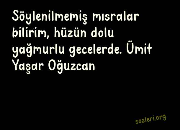 Söylenilmemiş mısralar bilirim, - Gece İle İlgili Sözler .. Söylenilmemiş mısralar bilirim, hüzün dolu yağmurlu gecelerde. Ümit Yaşar Oğuzcan ( Gece )