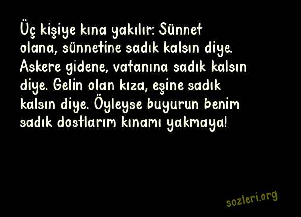 Üç kişiye kına yakılır: Sünnet olana, sünnetine sadık kalsın diye. Askere gidene, vatanına sadık kalsın diye. Gelin olan kıza, eşine sadık kalsın diye. Öyleyse buyurun benim sadık dostlarım kınamı yakmaya! ( Kına Gecesi )