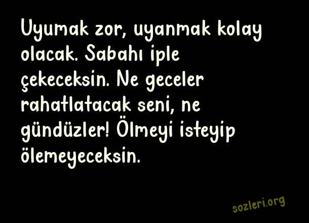 Uyumak zor, uyanmak kolay olacak. Sabahı iple çekeceksin. Ne geceler rahatlatacak seni, ne gündüzler! Ölmeyi isteyip ölemeyeceksin. ( Geceye Notlar )