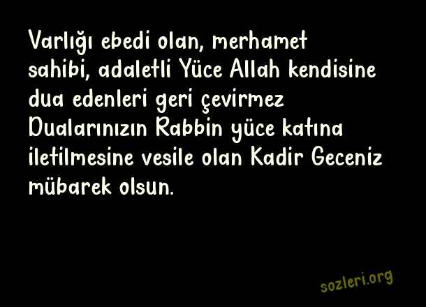 Varlığı ebedi olan, merhamet sahibi, adaletli Yüce Allah kendisine dua edenleri geri çevirmez Dualarınızın Rabbin yüce katına iletilmesine vesile olan Kadir Geceniz mübarek olsun. ( Kadir Gecesi İle İlgili Kutlama )