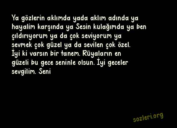 Ya gözlerin aklımda yada aklım adında ya hayalim karşında ya Sesin kulağımda ya ben çıldırıyorum ya da çok seviyorum ya sevmek çok güzel ya da sevilen çok özel. İyi ki varsın bir tanem. Rüyaların en güzeli bu gece seninle olsun. İyi geceler sevgilim. Seni ( Uzaktaki Sevgiliye İyi Geceler )